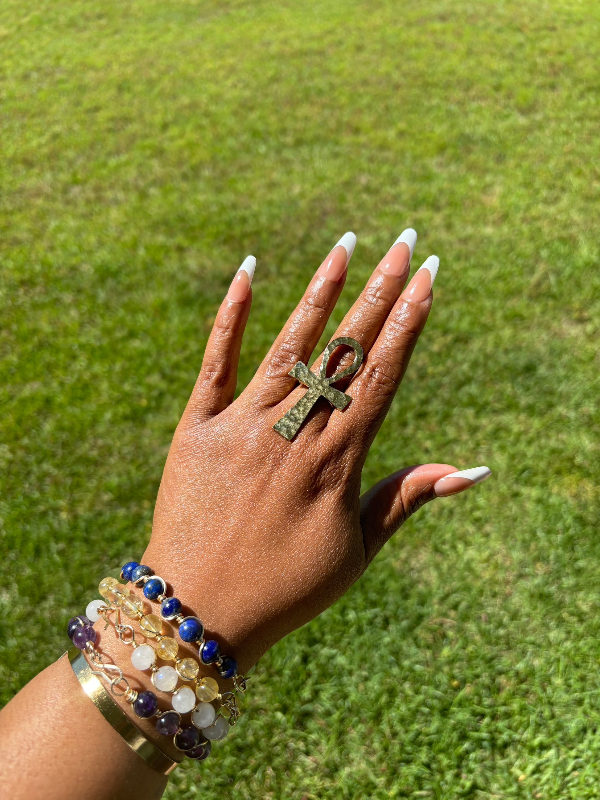 This adjustable Ankh ring is made from high-quality solid brass and is hammered for a unique and eye-catching finish. The Ankh symbol, which represents immortality and eternal life, adds a meaningful touch to this stylish piece of jewelry. With its durable material and customizable fit, this ring is perfect for adding a touch of elegance to any outfit.