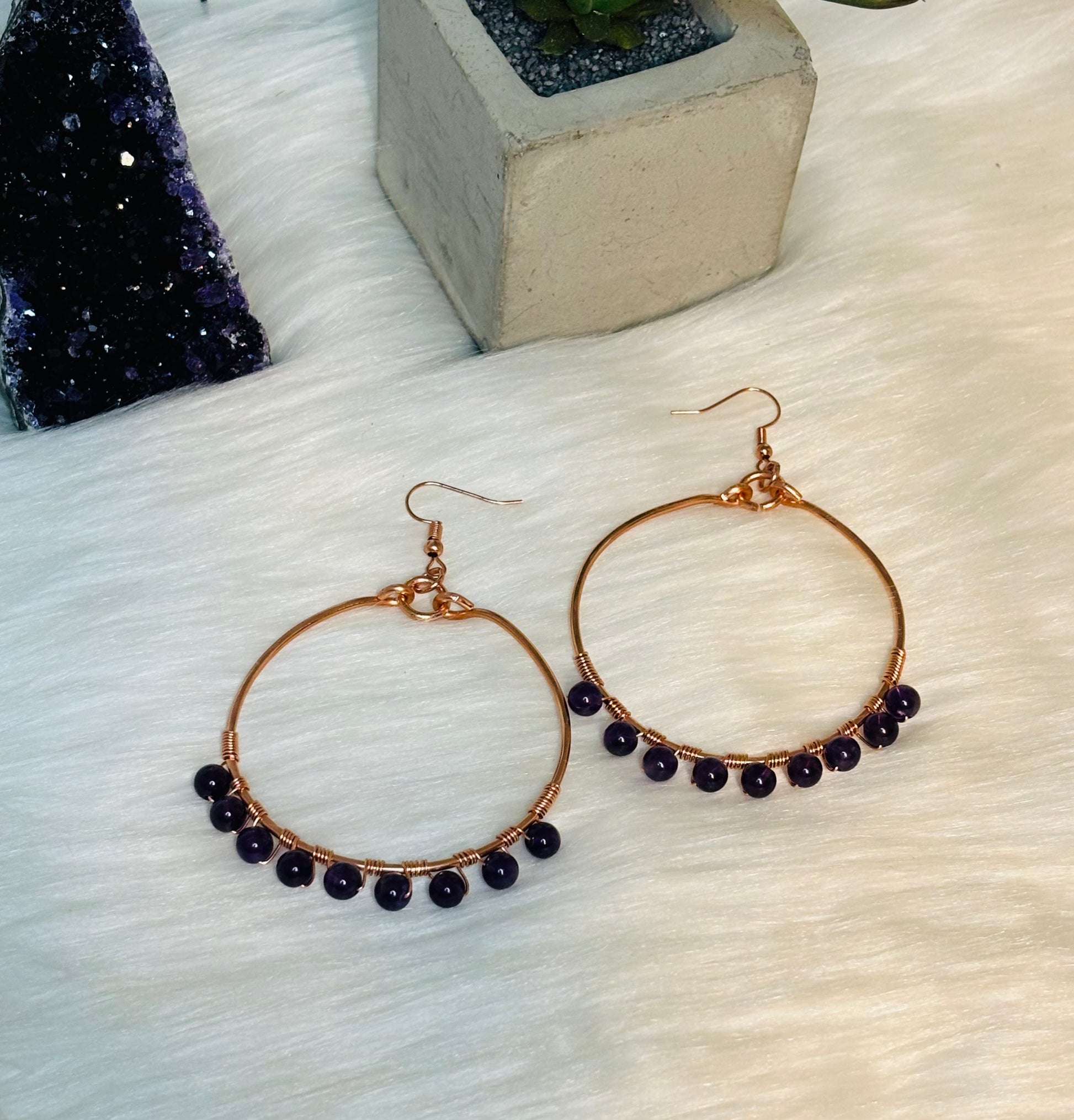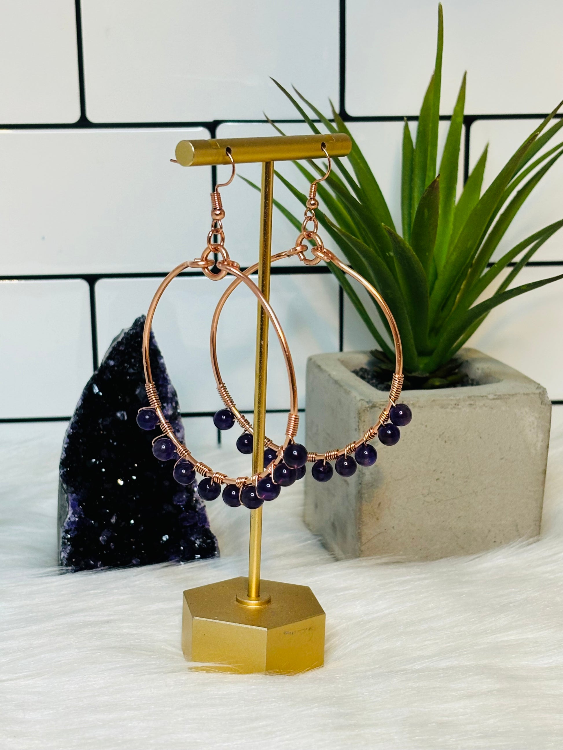 Expertly handcrafted, these Copper Amethyst Hoops showcase stunning genuine amethyst crystal beads. Made with quality copper, these earrings offer a unique and elegant touch to any outfit. Dazzle in the natural beauty and healing properties of amethyst with these exquisite hoops.