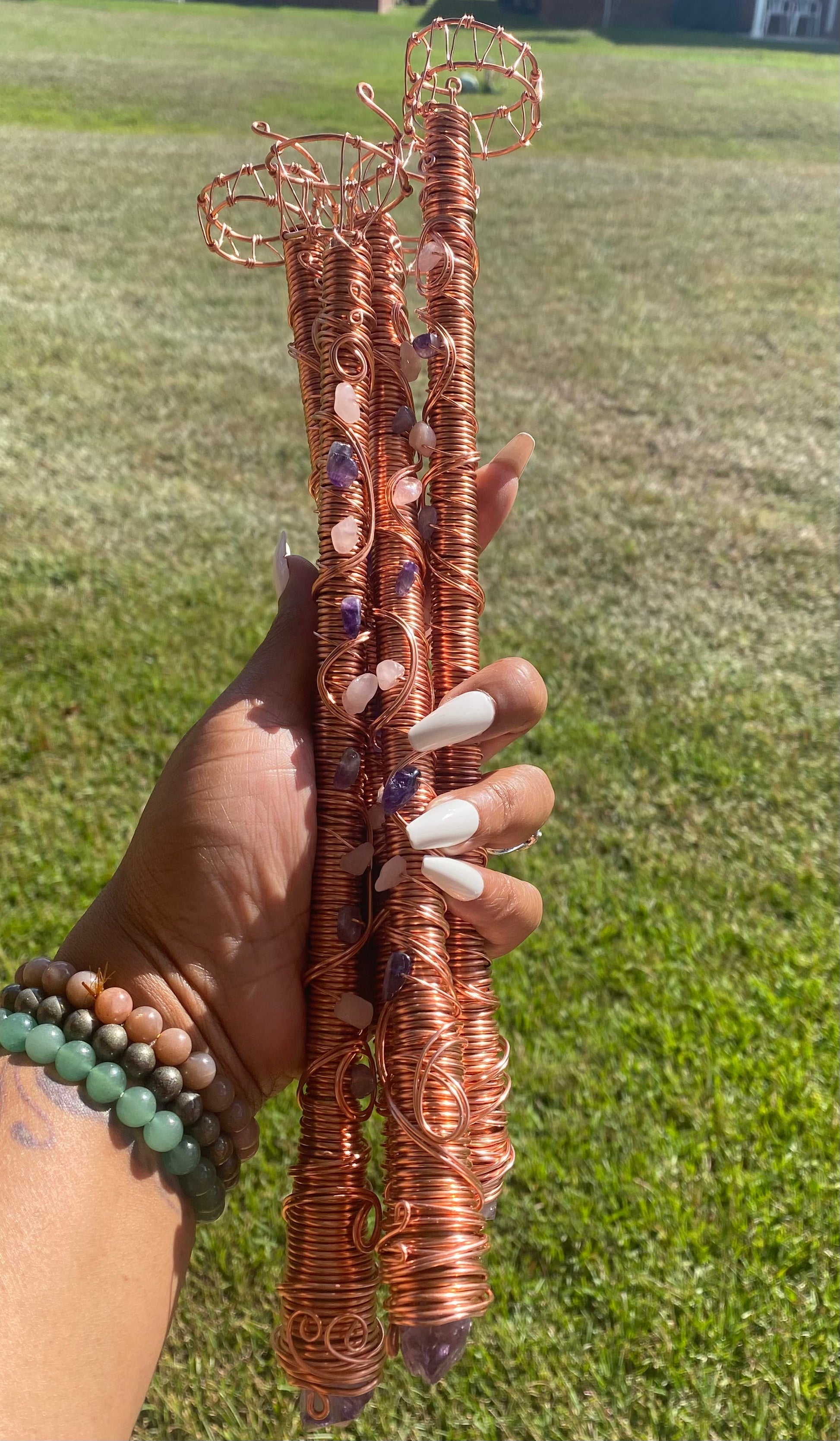 This handmade Copper Amethyst Smudge Wand is designed with Amethyst and Rose Quartz crystals for spiritual cleansing and calming. Perfect for purifying a space, the 12 inch copper wand also includes a blue sage bundle for an aromatic and cleansing experience. Allow up to 20 business days for order processing.