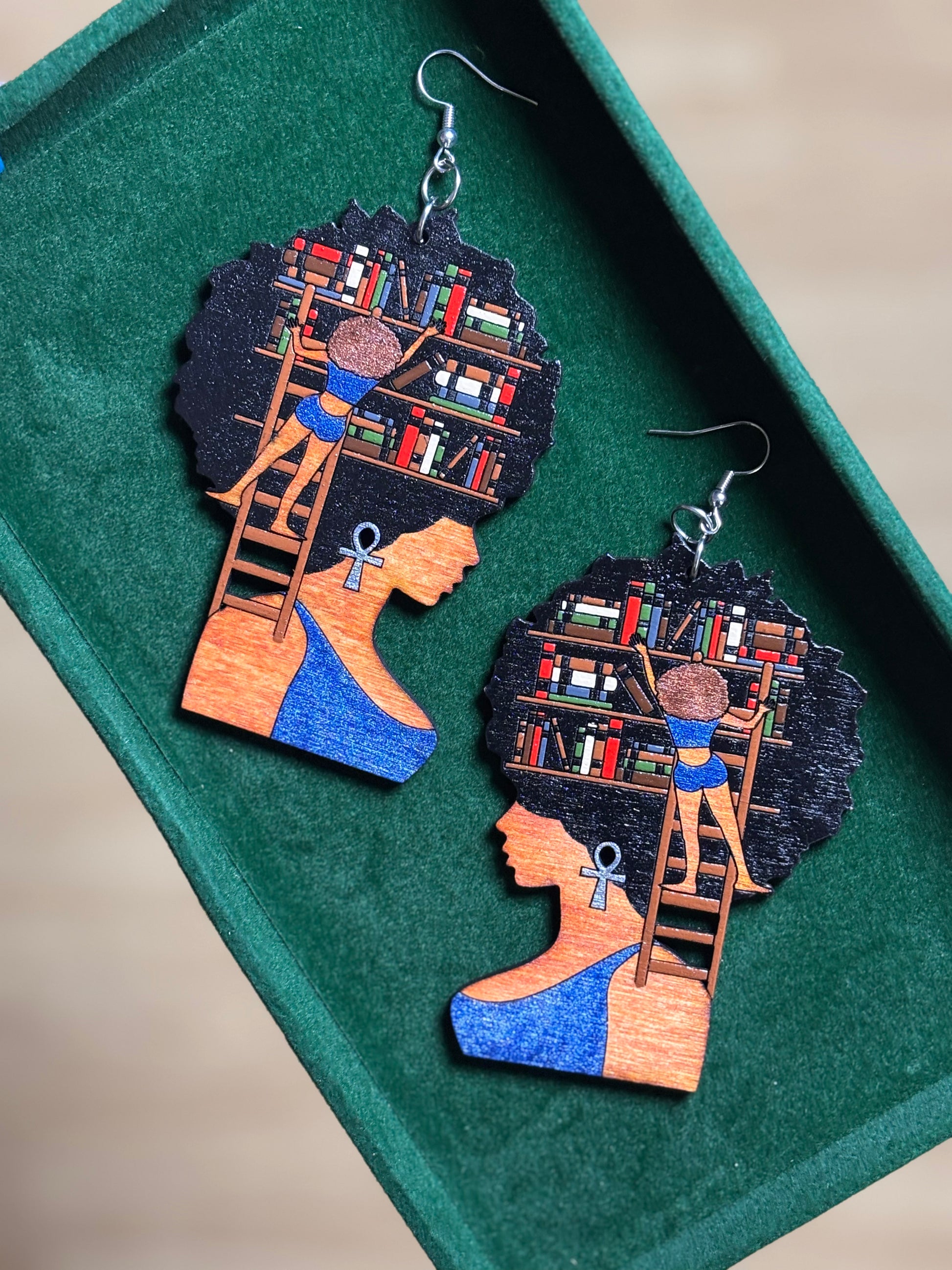 Celebrate beauty, strength, and wisdom with our Crown Of Knowledge Earrings. Hand-painted on lightweight birchwood, these vibrant earrings feature the silhouette of a woman with a crown of books, symbolizing empowerment and self-growth. Each piece showcases stunning Afrocentric artistry with rich colors and intricate details, finished with a protective coating for long-lasting wear. Despite their bold size, the birchwood keeps them ultra-lightweight and comfortable, making them perfect for all-day wear.