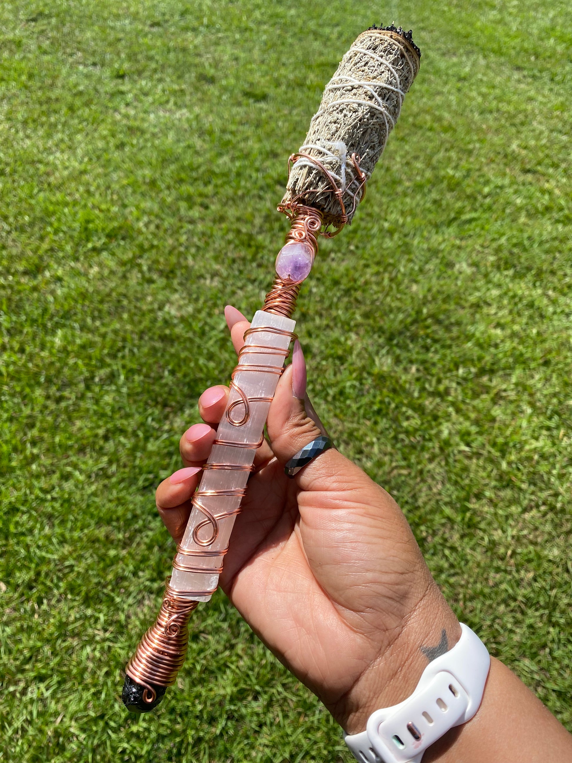 Create a serene atmosphere with this handmade 10 inch copper smudging wand. Featuring a combination of Black Tourmaline, Selenite and Amethyst crystals, the wand includes a Blue Sage bundle for added tranquility. Allow up to 20 business days for processing.