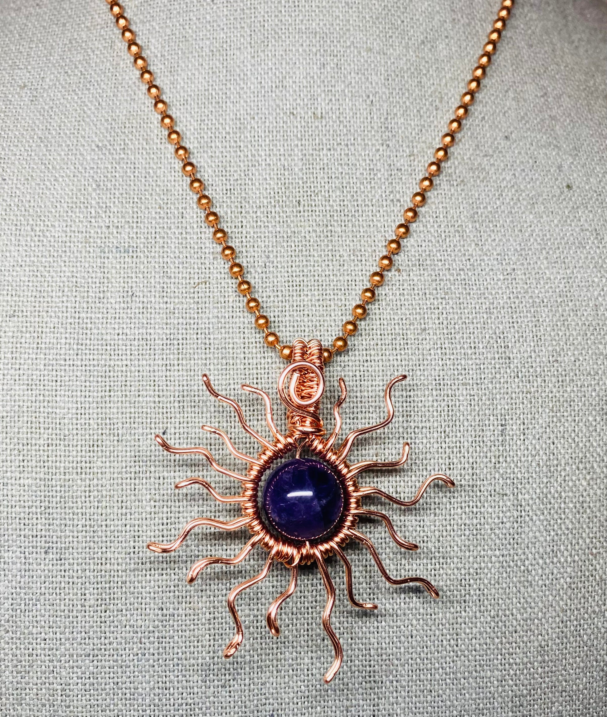 This stunning Sun Ray necklace is a unique piece of jewelry, hand-wrapped in copper wire or gold plated copper and strung on an 18-inch ball chain. Select from Amethyst, Rose Quartz, Lapiz Lazuli, Tigers Eye, or Green Aventurine crystal to complete the perfect look. Expertly crafted and one of a kind.